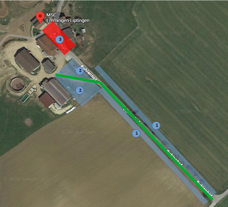 - Parken ist ausschließlich neben der Zufahrtsstraße auf den beiden Wiesen links und rechts in Fahrtrichtung erlaubt.
